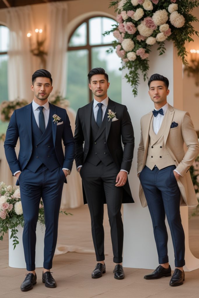 Men’s wedding fashion often revolves around suits, tuxedos, or traditional attire, depending on the cultural background of the wedding. A tailored suit in navy, charcoal, or beige works well for semi-formal weddings, while black-tie events call for a sharp tuxedo.