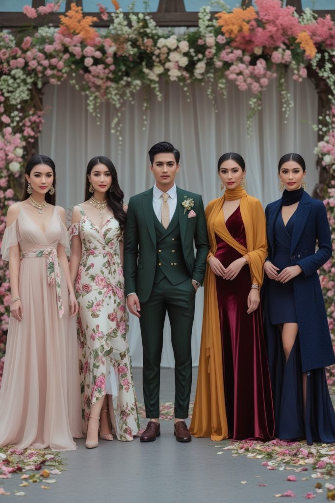 A classic choice for women is a mid-length or long dress in elegant fabrics like silk, chiffon, or satin. Floral prints are perfect for spring weddings, while jewel tones such as emerald, sapphire, or ruby make a stunning choice for evening receptions.