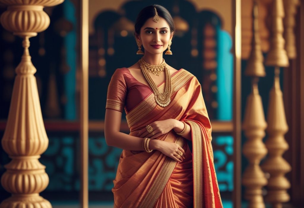• Kanjeevaram Silk Saree – regal and durable with bold temple borders.