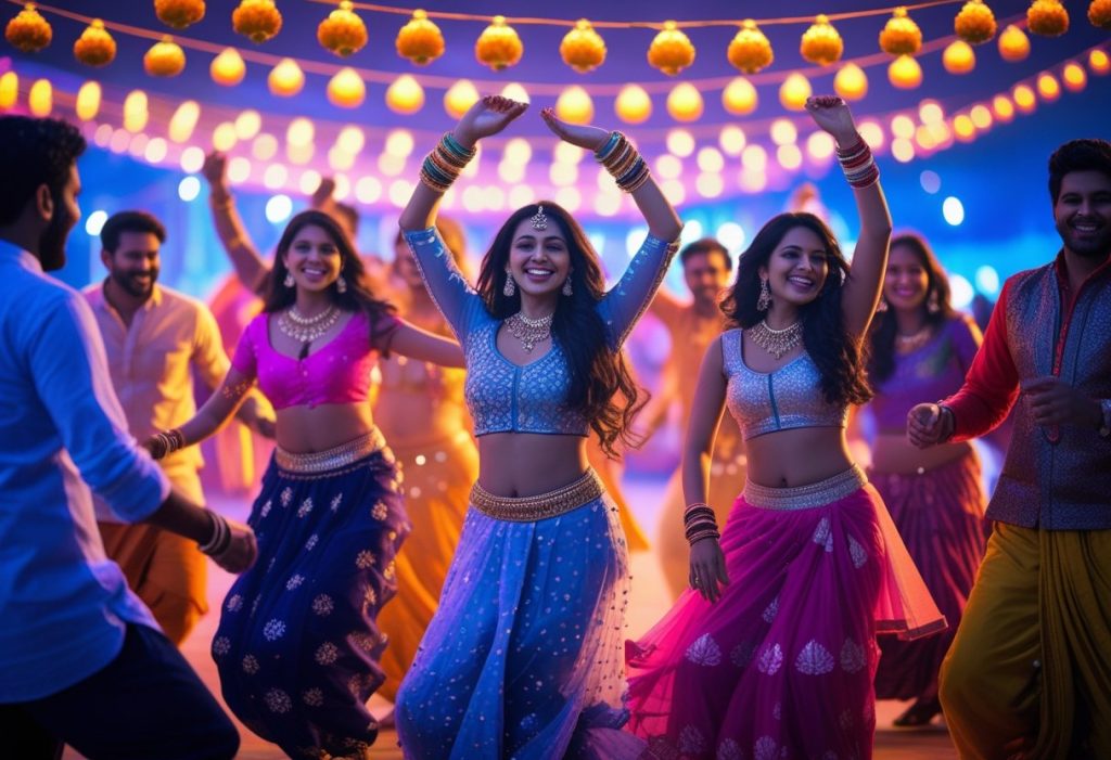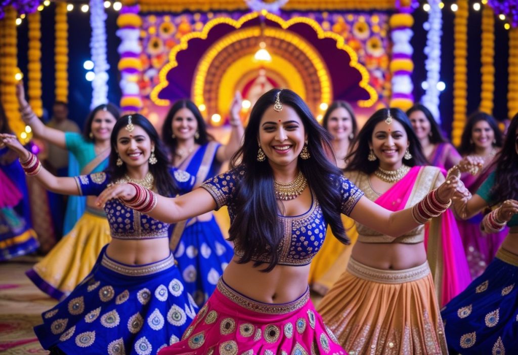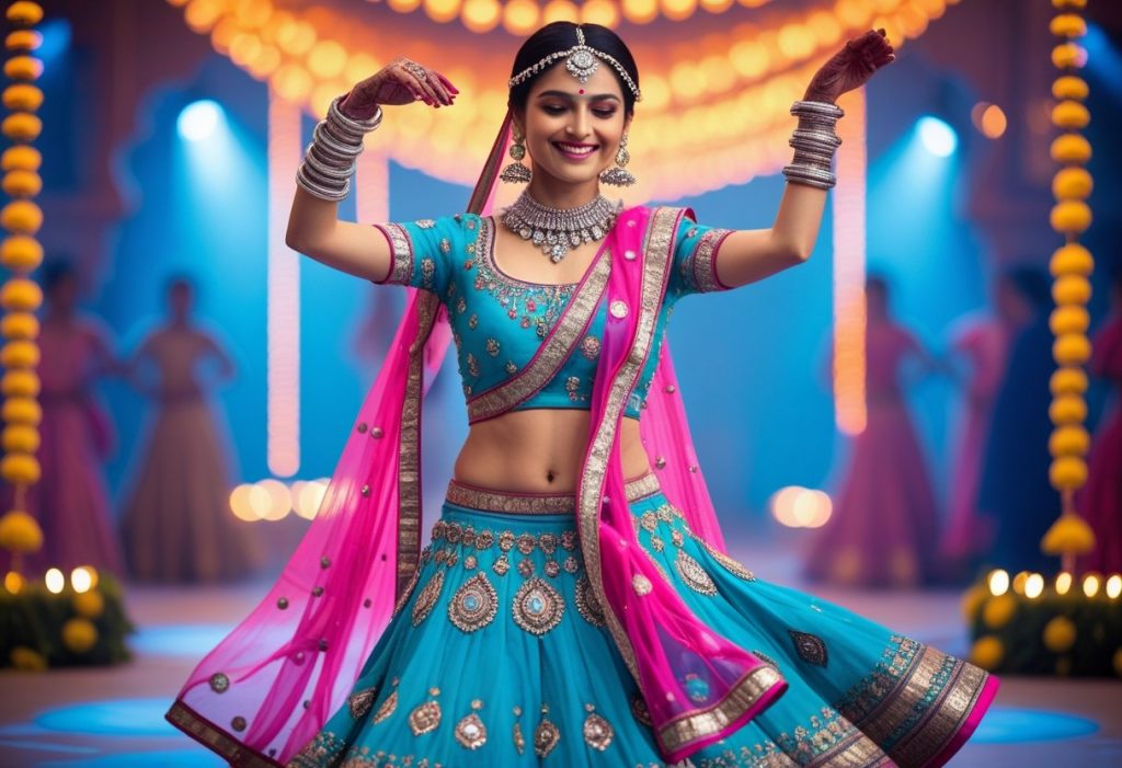 A mirror-work chaniya choli or Indo-Western lehenga works best β stylish yet comfortable for dancing.