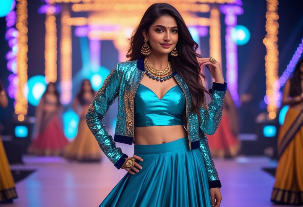 Mix tradition and trend with crop tops and flared skirts, or pair a mirror jacket with a plain lehenga.