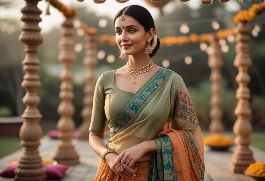 Add drama with layered skirts, tassels, and tribal jewelry. Earthy tones and handloom fabrics like cotton or khadi keep you comfortable.
