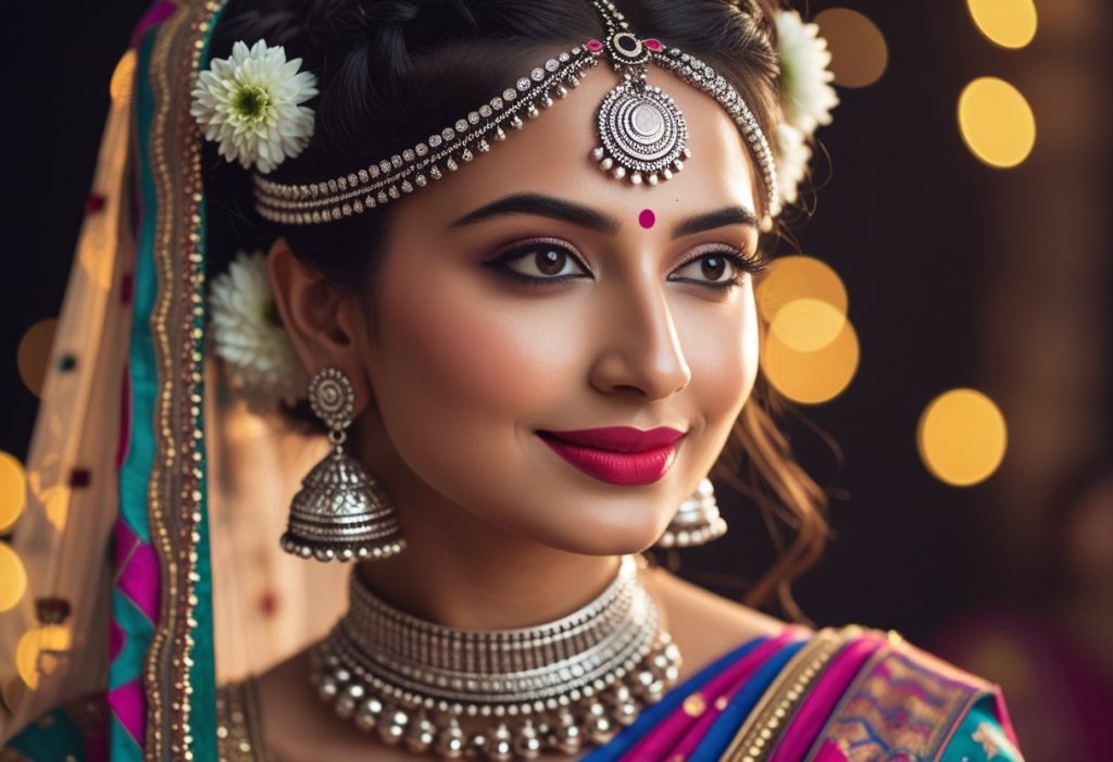- Hair: Braided buns with gajra or floral clips.