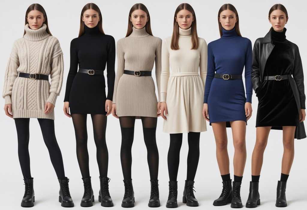 The Shirt Dress: This versatile piece can be styled from casual to office-ready. For winter, layer a thick turtleneck underneath and cinch the waist with a wide belt. Wear it with fleece-lined tights and tall leather boots. You can even experiment by wearing it unbuttoned as a duster coat over a turtleneck and jeans ensemble-8. Winter dresses