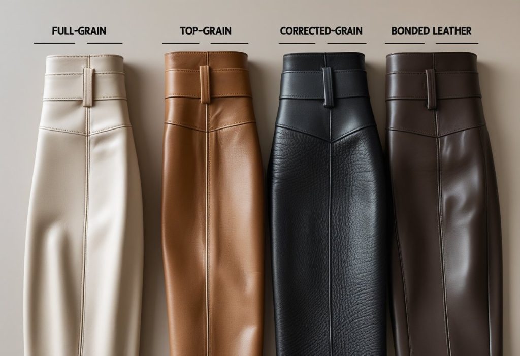 - Corrected-Grain Leather: Heavily processed to remove natural markings, often embossed with artificial grain patterns.