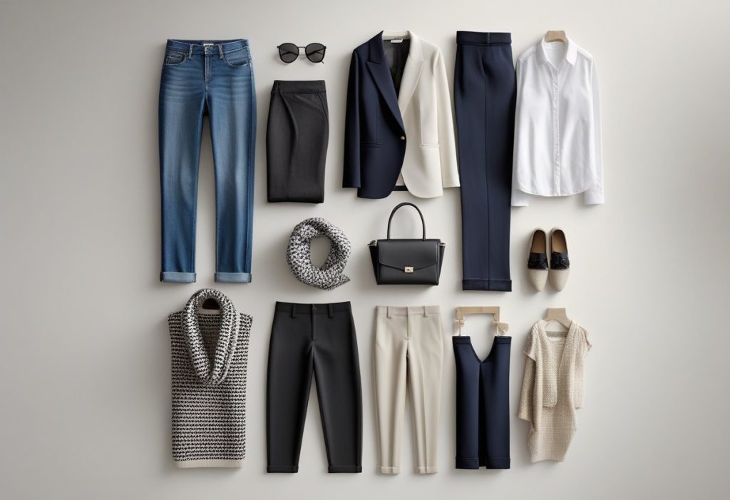 Start with foundation pieces: well-fitting jeans, a classic white shirt, a little black dress, tailored blazers, comfortable yet stylish trousers, and quality knitwear. These items should be in neutral colors (black, white, navy, beige, gray) that mix and match easily.