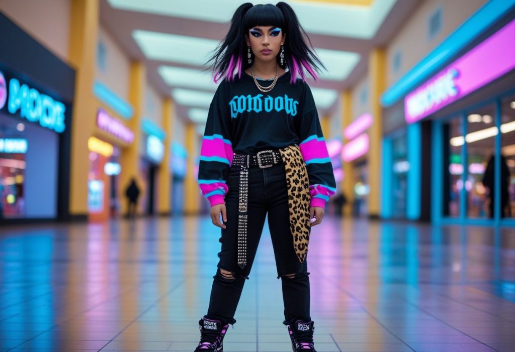 1. The Tiktok Scene: A modernized version featuring high-waisted parachute pants, a cropped band tee, and a pair of chunky platform sneakers (like Buffalo shoes or modern Fila disruptors). The hair is less towering but still features peek-a-boo color streaks.