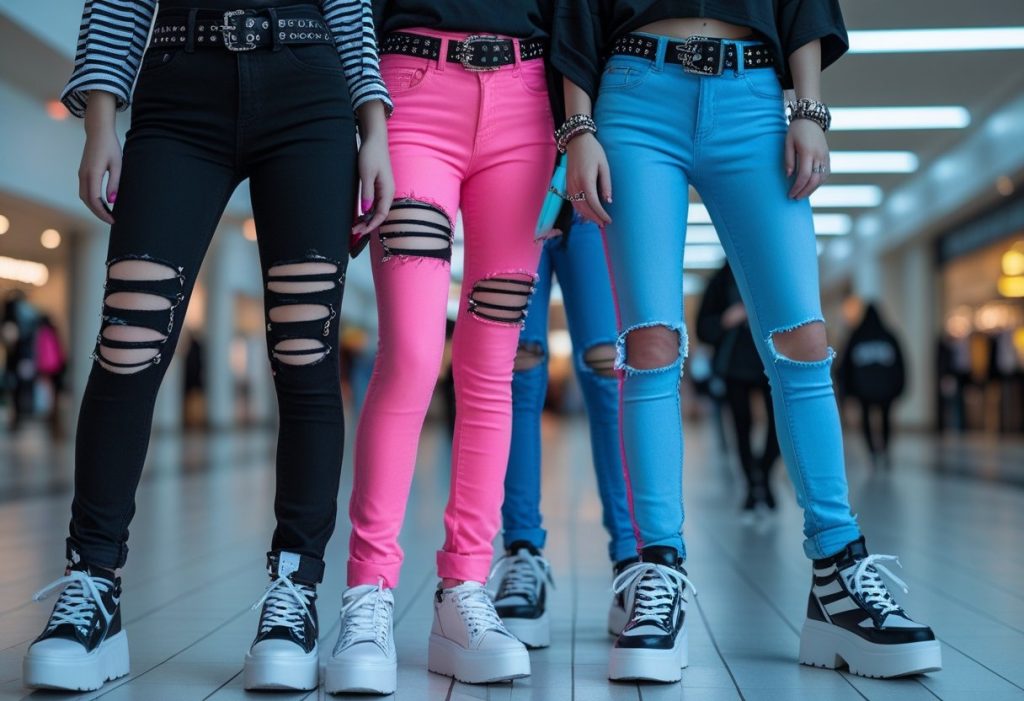 Scene clothing often involves delicate materials like fishnets, studded accessories, and heavily distressed denim.